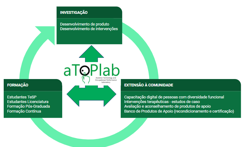O aTOPlab é um laboratório de investigação e formação para o estudo, desenvolvimento e aplicação de tecnologias de apoio (TA), assim como para o apoio à comunidade, sustentado numa política nacional global, integrada e transversal que equitativamente compensa e atenua limitações e restrições de pessoas com deficiência ou incapacidade, permanente ou temporária (Decreto-Lei n.º 93/2009, de 16 de Abril, Decreto-Lei n.º 42/2011, de 23 de Março), assim como colabora para a resposta aos desafios societais, pelo respeito pela diversidade e equidade na transformação digital da Europa. Integra ainda a realização de estudos que liguem a promoção do desempenho ocupacional através de treinos cognitivos e funcionais específicos com recurso à tecnologia.